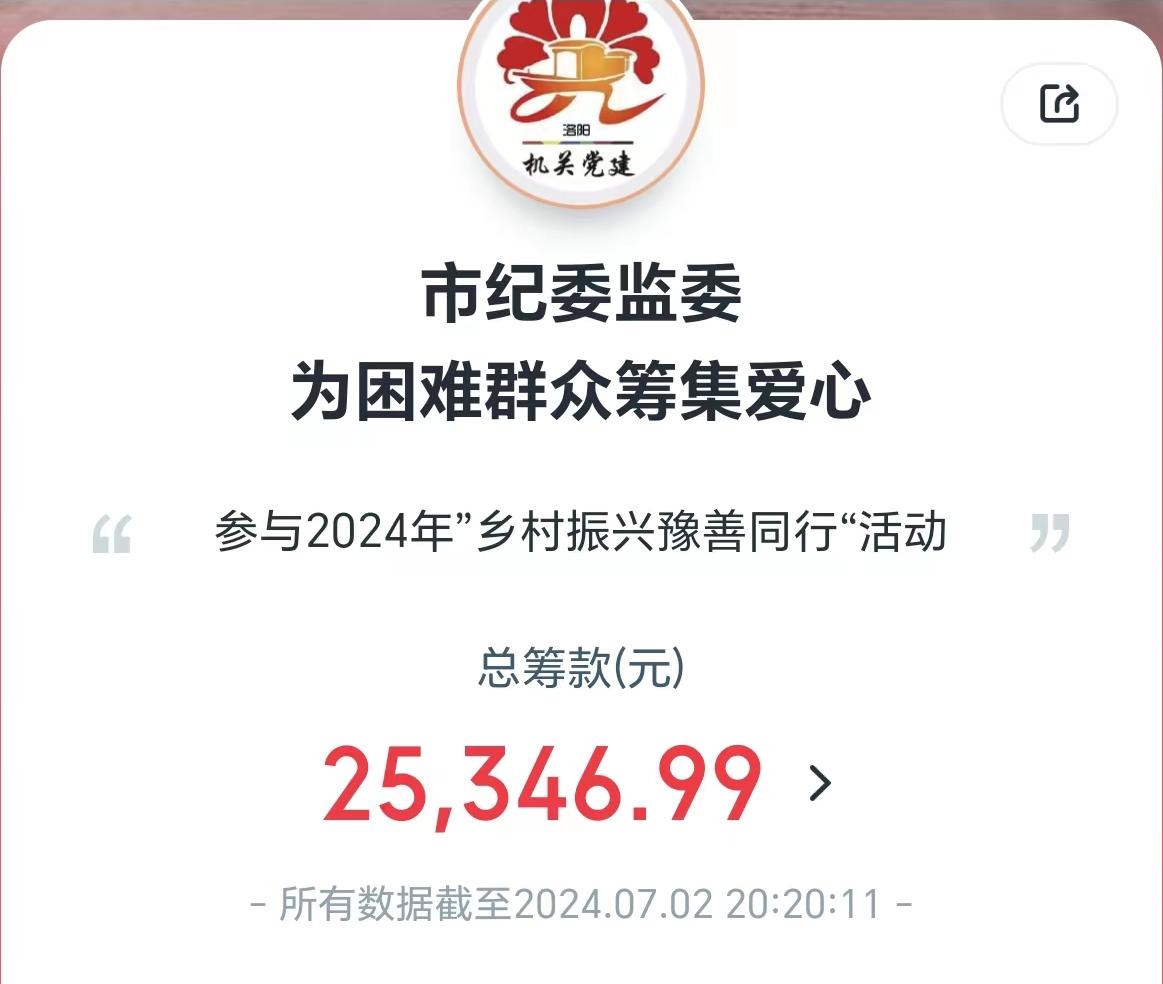 截至7月2日,市纪委监委共筹集爱心资金25,346.99元,在全市市直机关排名第五位,以实际行动,积极助力乡村振兴、扶弱济困、急难救助等项目建设。(机关党委)
