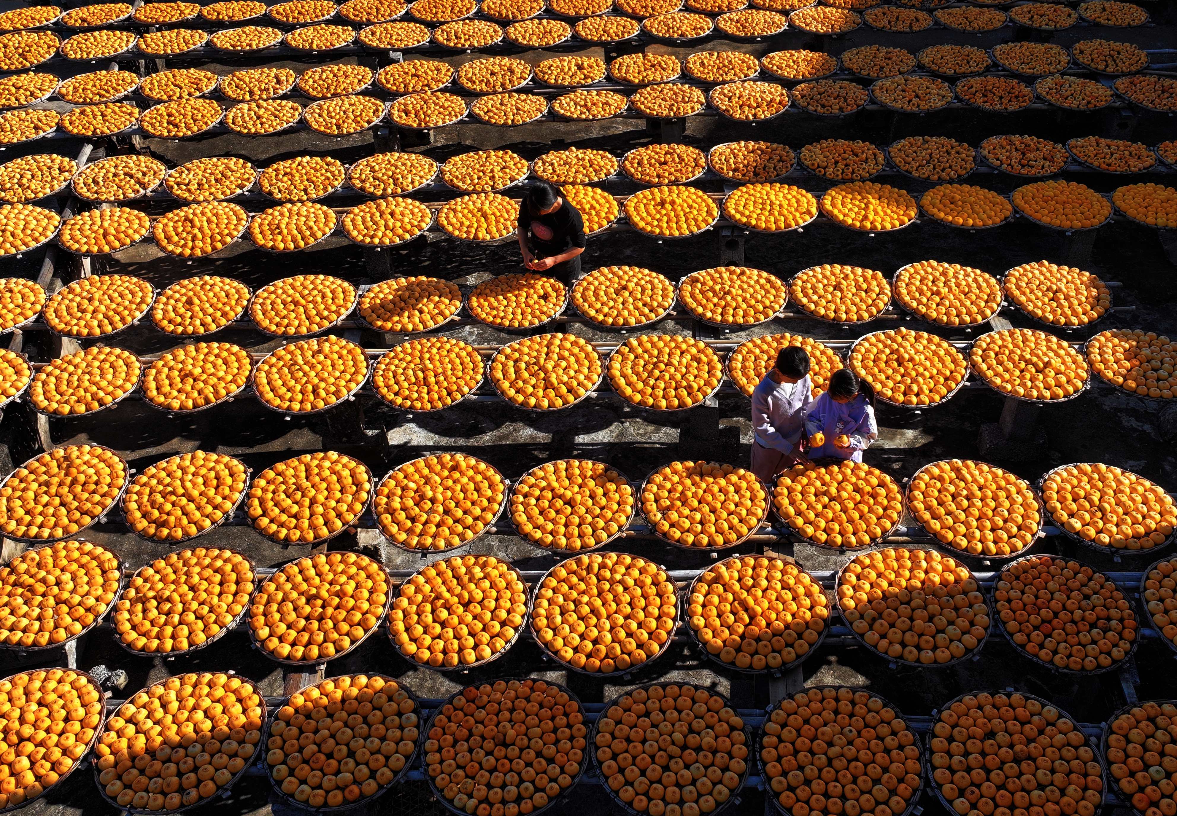 广西壮族自治区恭城瑶族自治县的农户利用晴好天气制作柿饼,房前屋后晒满了金灿灿的柿子,在光与影的错落间铺成金色织锦。(广西壮族自治区恭城瑶族自治县纪委监委供 李茂香 摄)
