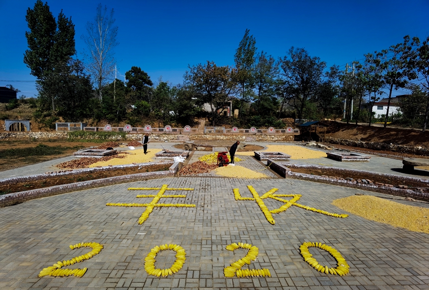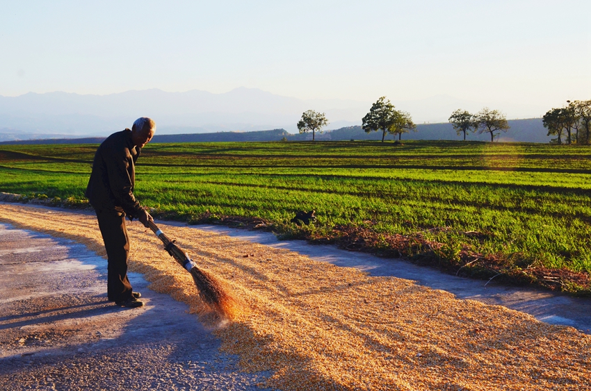 金秋时节,农民抢抓好天气,晾晒着丰收的喜悦。玉米金黄,麦苗青翠,手里的扫帚仿佛画笔一样在温馨恬静的村庄里谱写丰收与希望的诗篇。(洛宁县纪委监供 邱宗勤摄)