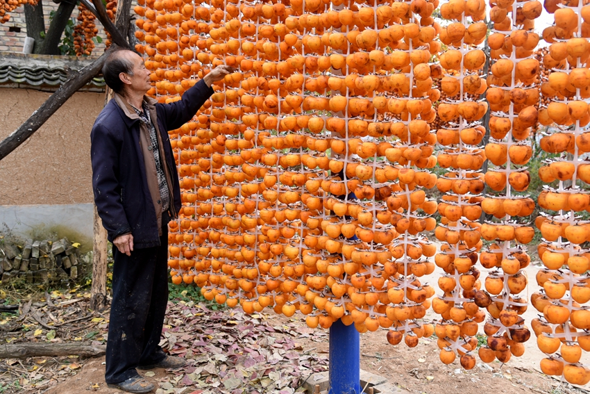 金秋的乡村,一串串红红火火的柿子像灯笼一样,点缀着户户庭院,照亮幸福生活。图为农民在对进行柿子削皮,晾晒,为晒柿饼做准备。(洛龙区纪委监委供 段占军摄)