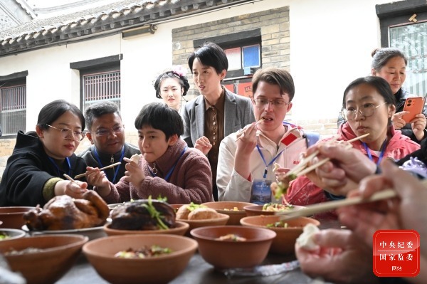 迎“五一”假期,山东栖霞牟氏庄园推出游庄园、赏牡丹、品牟家“八大碗”等特色旅游活动。图为来自国外的部分游客,正在牟氏庄园景区品尝特色菜系“八大碗”,即扣肉、猪肘、茄子蒸咸鱼、烧鸡、小葱虾酱、咸菜丝、四喜丸子等胶东特色菜品。(山东省栖霞市纪委监委供 苗恒源 摄)