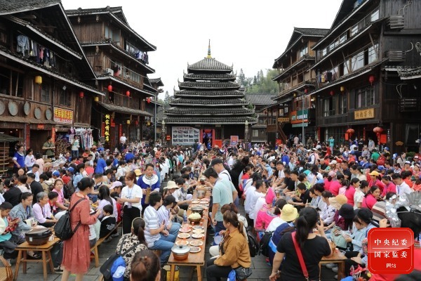 “百家宴”是侗族一种特殊的饮食习俗,也是接待贵客的最高礼仪之一。“五一”小长假,广西壮族自治区三江侗族自治县林溪镇以“百家宴”形式迎接五湖四海游客。(广西壮族自治区三江侗族自治县纪委监委供 吴海册 摄)