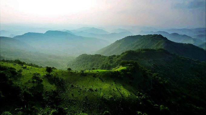 大暑来临,朱阳镇冠云山上,绿毯般的草坡披满了山体,苍翠的树木,远处的山峦在晨雾下若隐若现,让人流连忘返。(灵宝市纪委监委 李永乐 摄)