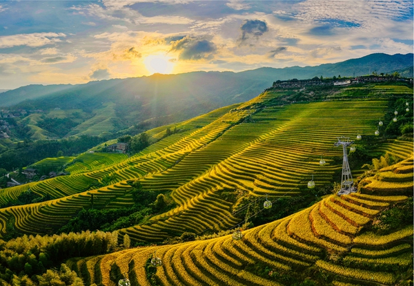 落日熔金,洒在十月的龙脊梯田,层层叠叠的田垄化作一条条蜷卧的黄龙。它脊背的每一道“鳞甲”,都盛满了农人沉甸甸的丰收希望。(广西壮族自治区龙胜各族自治县纪委监委供 潘盘辉 摄)