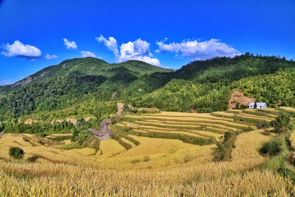 蓝天缀着棉絮似的白云,十月的风拂过金黄梯田,让这如大地五线谱的稻垄,向葱郁山峦层层铺展,山野间满是秋的澄澈与丰饶。(福建省长汀县纪委监委供 陈菊华 摄)