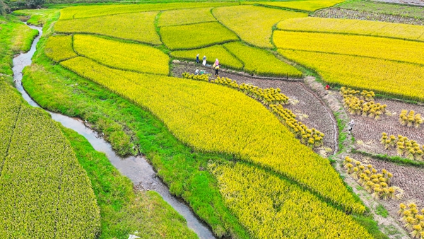 金秋十月,云南省陆良县芳华镇红石岩村的稻田连片铺展,汇成一片金色的海洋。村民们挥镰收割成熟的水稻,田间地头皆是热火朝天的丰收忙碌景象。(云南省陆良县纪委监委供 王勇 摄)