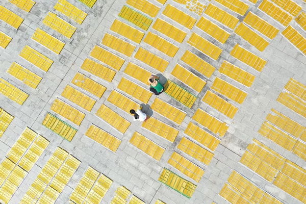 金秋时节,走进江西省全南县南迳镇大田村,一张张金黄色的烫皮在暖阳下铺展,村民们娴熟地翻动、晾晒,构成了一幅洋溢着客家风情的“晒秋”图景。(江西省全南县纪委监委供 李国强 摄)