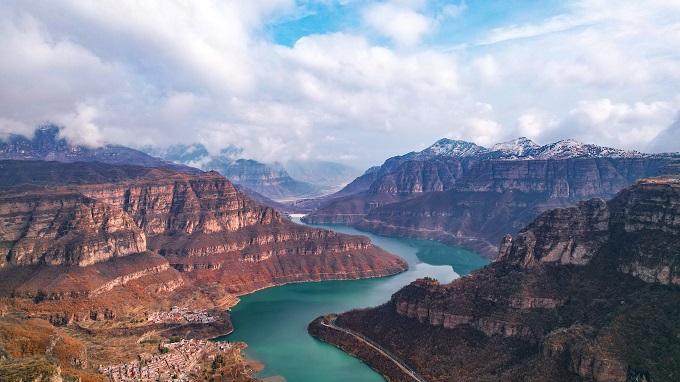 阳春三月,头顶蓝天、脚踩白云,站在太行之巅,抬头望,一侧隔沟遥对的是连绵不断的高山,巍峨高峻,挺拔秀丽;低头看,太行平湖像一枚妩媚的翡翠,呈玉钩状,镶嵌在峡谷中间。(林州市纪委监委 秦阳 摄)