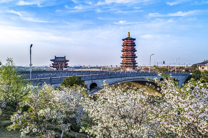 四时最好是三月,春风春意满人间。朱樱桥畔,高耸入云的朱樱塔和古朴典雅的团城阁相依相伴,在蔚蓝天空、丝丝白云和树树春花的映衬下,定格成了一幅美不胜收的瀍壑朱樱图。(洛阳市涧西区纪委监委 段万卿 摄)