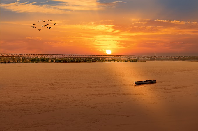 春日初升的太阳散发出金色的光芒穿透云雾的薄纱,洒满了湖面,湖中停泊的小船与空中飞过的候鸟动静相衬,犹如一幅金色的画卷,美的醉人。(新密市纪委监委 朱留波 摄)