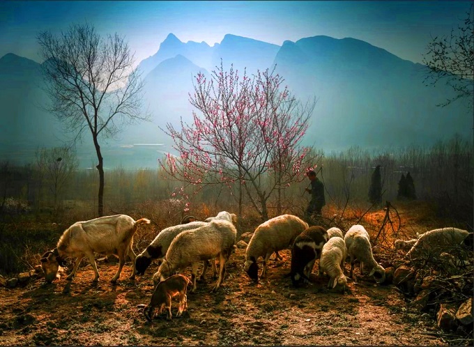 春天,阳光洒在山下的草地上,一片生机勃勃。农民赶着羊群,漫步在这片绿意盎然的世界里。山坡上,野花竞相开放,五彩斑斓,仿佛是大自然打翻了调色盘。(登封市纪委监委 郝晓飞 摄)