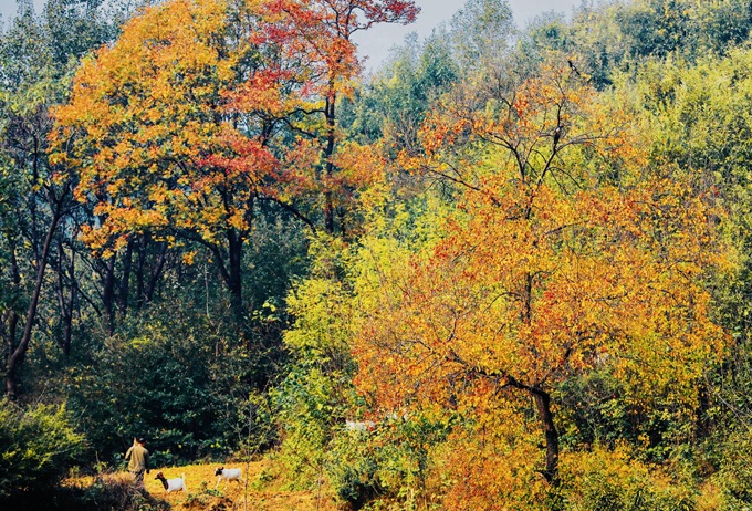 九月把秋光裁成细碎的金箔满撒在山间,深绿的枝丫还恋着夏末的余温,几树红叶却已偷藏了晚霞,露出橘黄橙红的叶尖。牧羊人引着几只山羊,慢悠悠行走在泛黄的草坡,羊蹄踏过,惊起草窠里一两声虫鸣,好一派悠然的初秋山野图景。(舞钢市纪委监委 安孟辉 摄)