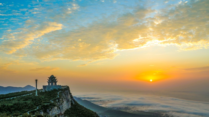 天微亮,淇县云梦山的南天门矗立山巅,静静候着日出。朝阳刺破天际,霞光泼洒开来,染得云海泛红。翻腾的云海在山腰间流淌,与橙红霞光交织,南天门的轮廓在光影中愈发挺拔,整幅画面壮阔又灵动,满是朝气。(鹤壁市纪委监委 冯水根 摄)