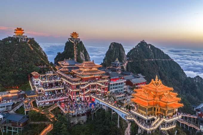 远赴人间惊鸿宴,一睹人间盛世颜。金秋九月,洛阳市老君山云海翻涌、山峦竞秀,建筑群依山而立,精美辉煌、雄浑气派。人们登高山、赏云海,尽享自然的壮美和人文的瑰宝。(洛阳市涧西区纪委监委 段万卿 摄)