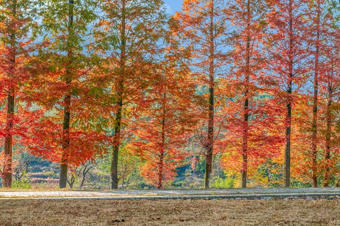 秋意悄然晕染山林,树木如被大自然的彩笔点染,红橙黄绿交织成画,蓝天为幕,脚下黄草也似在低吟,将秋日的诗意悠悠铺展,恍若走入诗词里的秋光。(新密市纪委监委供 朱留波 摄)