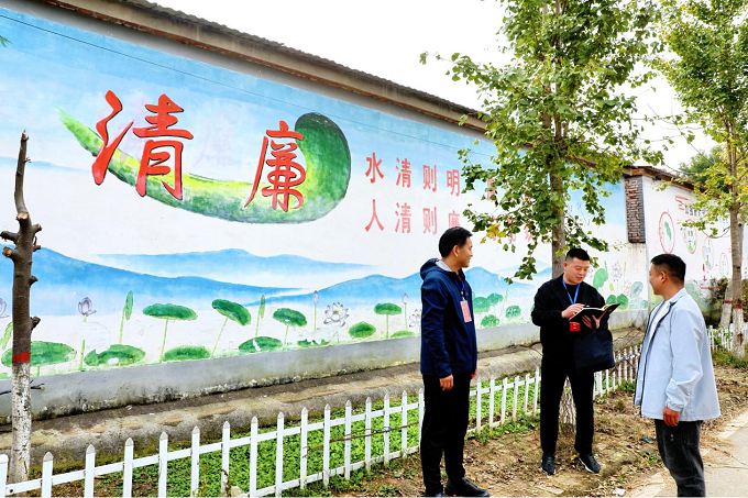 确山县纪委监委将廉洁文化融入乡村治理,以廉政墙绘、廉洁标语等形式打造乡村廉洁文化阵地,推动廉洁理念浸润人心。图为确山县纪检监察干部在留庄镇大赵楼村,围绕廉洁文化建设成效及基层干部作风情况开展实地走访调研。(确山县纪委监委 王敬一 摄)