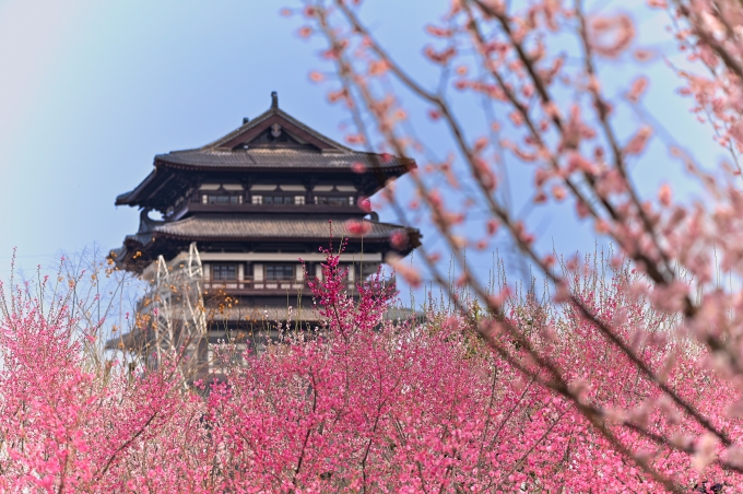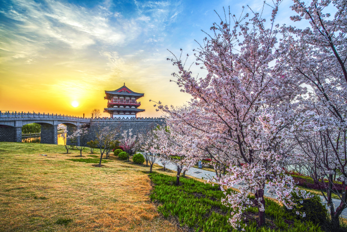 春分时节,天朗气清,万物萌发。团团簇簇的花朵在樱树上织就一片片粉白色云霞,让芬芳散入春风飘满洛城,古朴的城楼沐浴在橘色的霞光中,与蓝天白云相互映衬,更显雄伟壮丽。(洛阳市涧西区纪委监委 段万卿 摄)