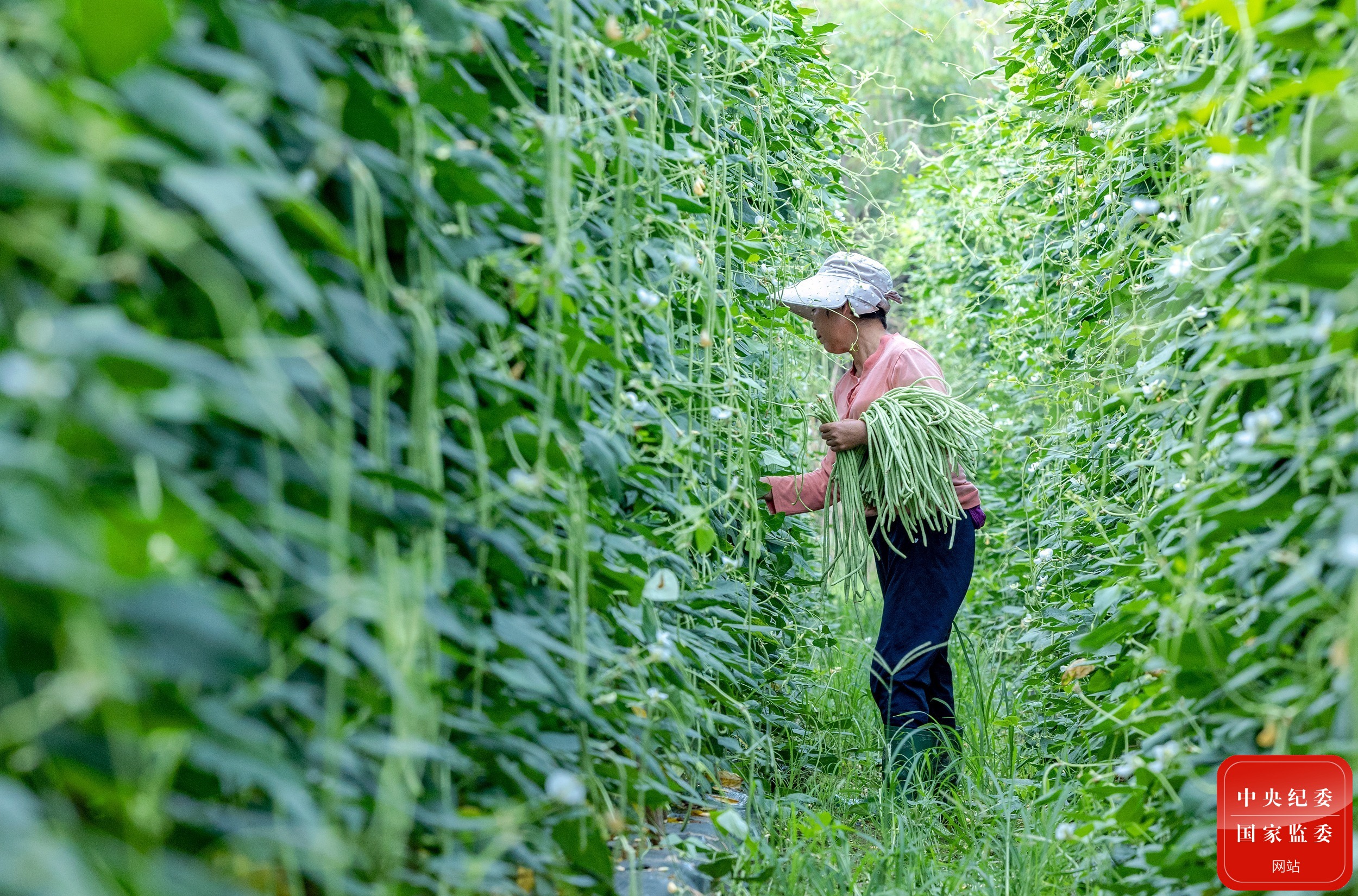 盛夏时节,草木葱茏,蔬果飘香。在广东省连州市连州镇昆陂村,细长的豇豆挂满了枝头,村民正在忙着采摘。(广东省连州市纪委监委供 罗敏 摄)