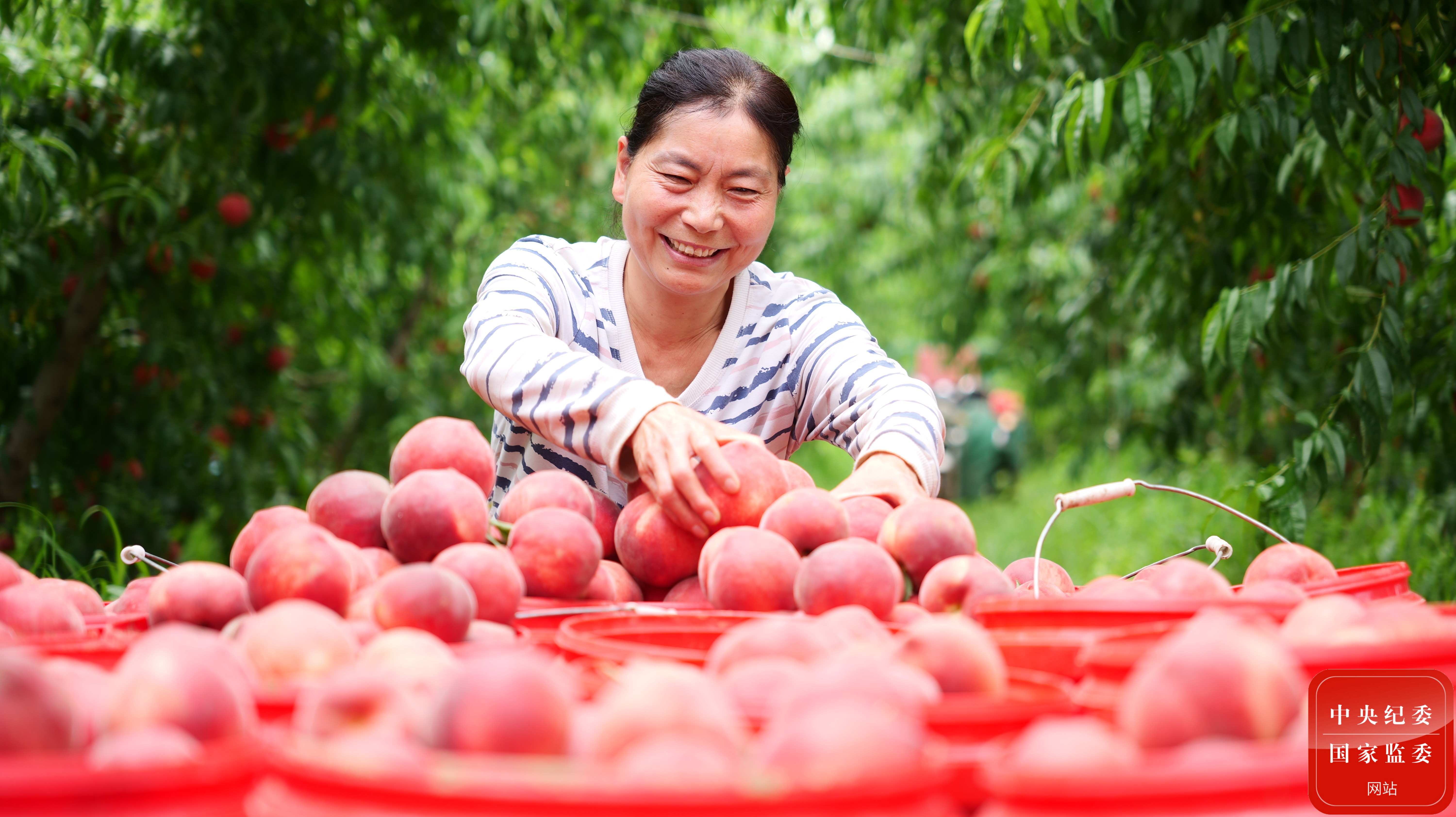 河南省洛阳市孟津区送庄镇千亩鲜桃喜获丰收,光鲜红润的鲜桃挂满枝头,香飘十里。图为该区农业园区的果农正在采摘鲜桃,丰收的喜悦溢于言表。(河南省洛阳市孟津区纪委监委供 吕晓鹏 摄)