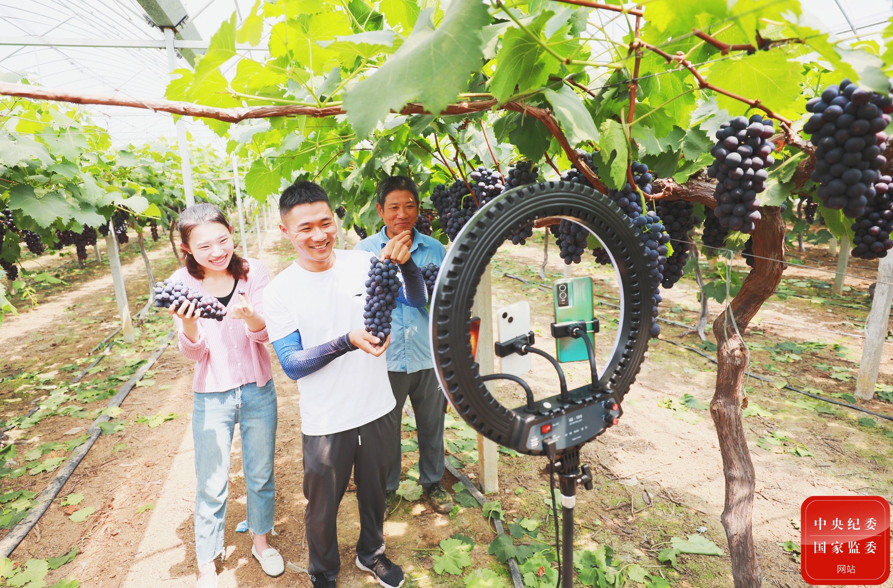 又到葡萄飘香时,江苏省盱眙县河桥镇某葡萄种植大棚,一串串黝黑亮紫、个头饱满的夏黑葡萄挂满枝头,圆润如珠、沁香如墨,吸引着众多游客前来采摘。图为果农们在葡萄园内进行直播介绍。(江苏省盱眙县纪委监委供 王小龙 摄)