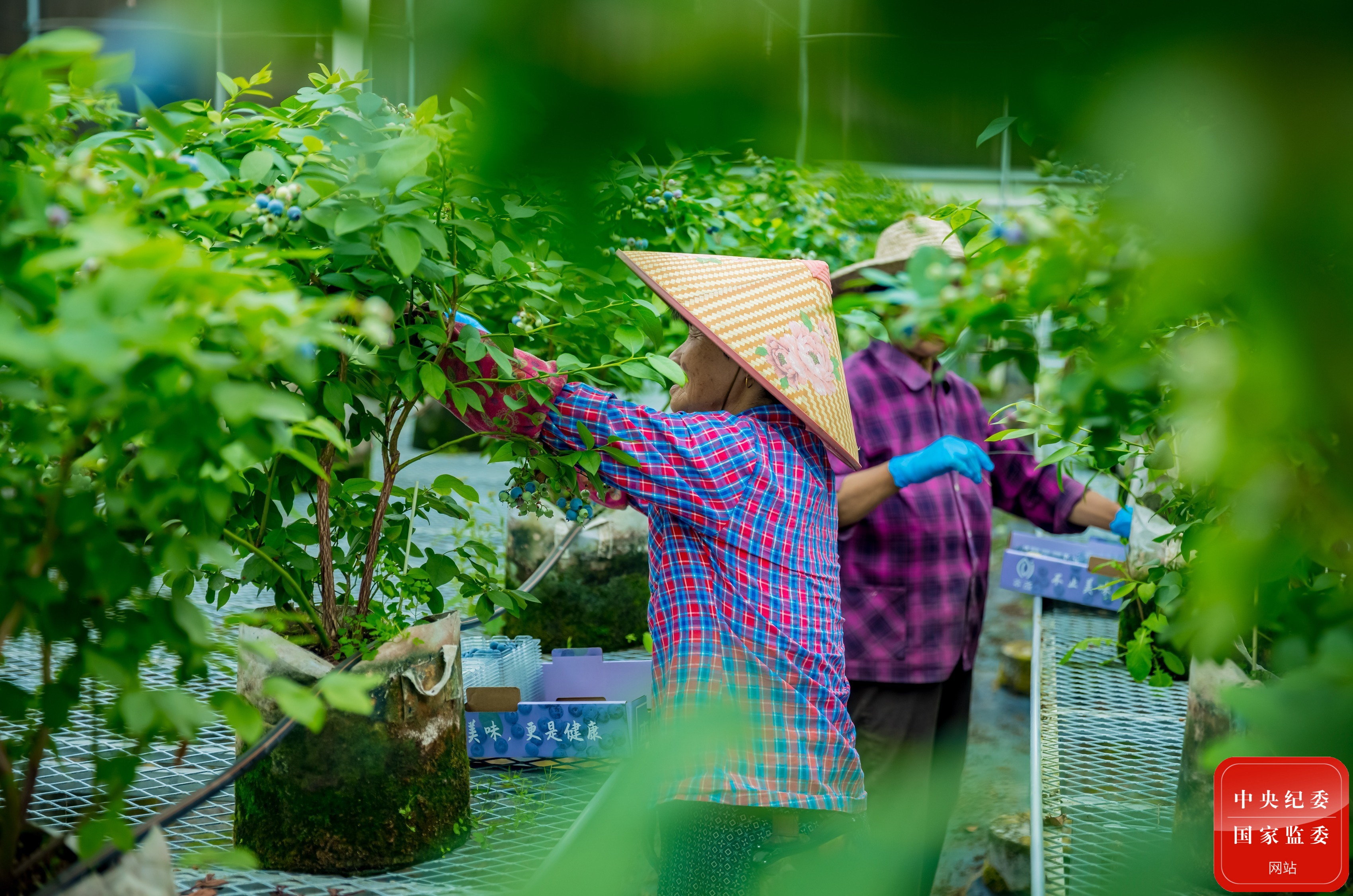 浙江省平湖市广陈镇积极引入先进种植技术,力求以无公害环控种植方式生产无农残、无激素蓝莓鲜果。图为该镇农场大棚中种植的3万多株蓝莓进入盛果期,迎来第一年大面积采摘。(浙江省平湖市纪委监委供 王莉晓 摄)