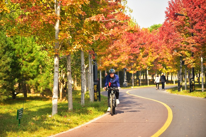 山远天高烟水寒,相思枫叶丹。立冬时节,枫叶层层叠叠如朝霞满天,市民朋友们骑行穿梭其中,仿佛置身于一幅美妙的画卷中。(开封市龙亭区纪委监委 刘兵 摄)
