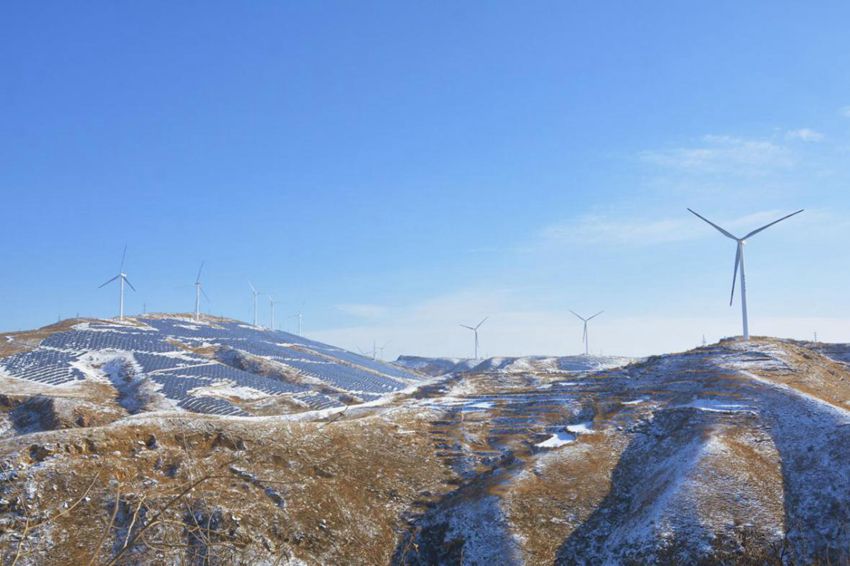 【北风带雪风车驰】呼啸的冷风吹开了皑皑的白雪,露出了大地,宜阳县樊村镇牵羊坡,湛蓝的天空下,随风转动的白色风车和熠熠生辉的光伏板构成一道美丽风景,吸引观雪游客耍雪和赏景。(宜阳县纪委)