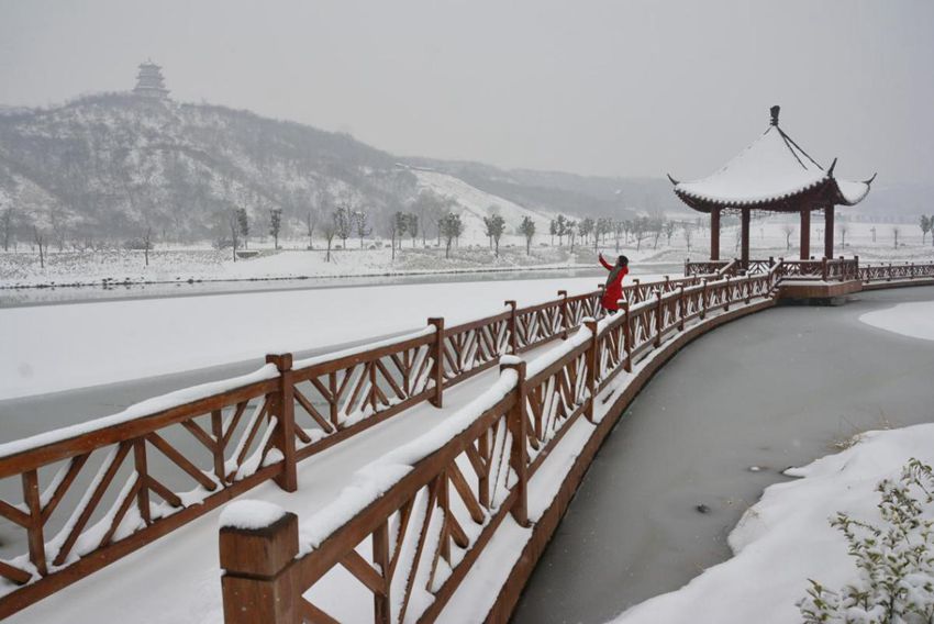 【园区雪韵】宜阳县七彩花海园区,白雪皑皑,世间万物回归至最初的纯洁模样,亭塔遥相呼应,似乎在用静默诉说一个凄美的爱情故事,红衣女子留影其间,顿时点亮这片白,打破那一片沉寂。(宜阳县纪委)