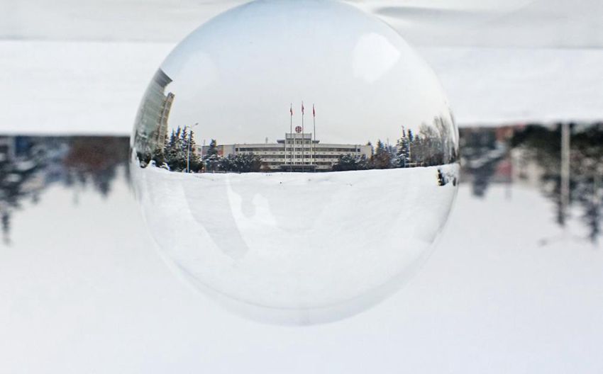 【水晶球里世界】2018年1月7日,河南洛阳涧西区建设路,在水晶球的倒影下,街心花园仿佛在雪的魔幻之中。(黄政伟)