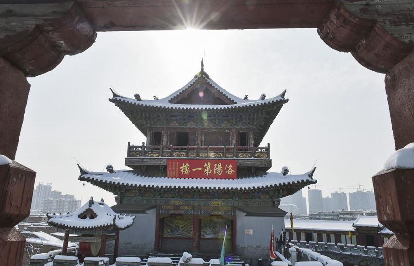 【洛阳雪韵】2018年1月7日,河南洛阳丽景门城楼,大雪覆盖了城墙的灰色砖瓦,古韵纯净。(黄政伟)