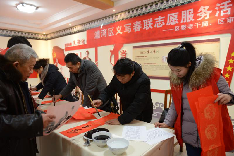 【廉政教育进万家,遍地盛开文明花】为了加强对党员干部春节期间的家风教育,在小年来临之际,吉利区纪委监委组织书法爱好者们赴社区义写春联,副副寓意深远的廉政春联、好家风春联受到社区居民的热烈欢迎。图为吉利区书法爱好者们在河阳新村社区义写好家风春联的热烈场面。(吉利区纪委监察委)