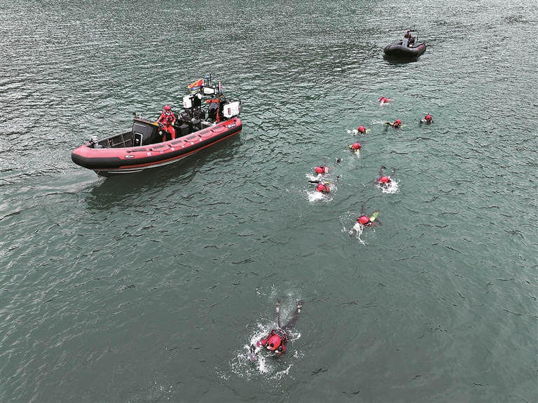 汛期来临,四川省森林消防总队特勤大队联合成都市应急管理局,在岷江、锦江举行防汛应急救援实战演练。图为近日,消防救援人员在岷江成都段开展多人涉水横渡训练。 新华社发(程雪力 摄)