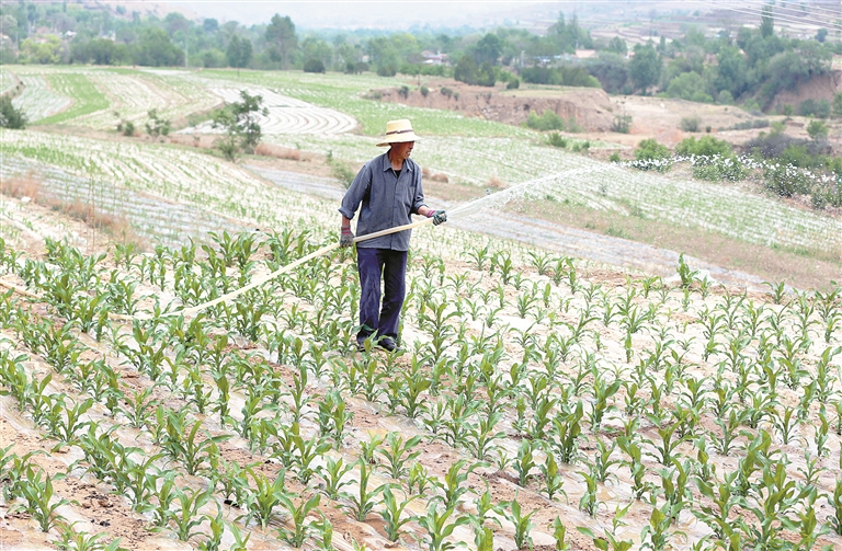 连日来,受气温偏高、降水偏少等影响,甘肃省定西市通渭县出现旱情。通渭县开展抗旱减灾工作,及时调配水源、科学调度灌溉,保障农业灌溉用水需求。图为近日,在该县寺子川乡,农民给玉米地浇水。 新华社发(王克贤 摄)