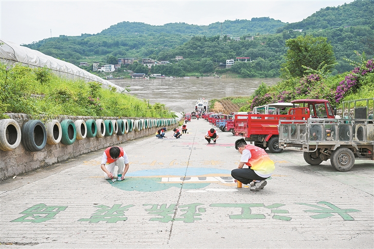 近日,重庆财经学院10支志愿者团队的300余名志愿者在重庆市巴南区多个镇街开展暑期社会实践活动,为当地居民提供健康医疗、直播带货、教育帮扶、文化传承等方面的志愿服务。图为志愿者在巴南区中坝岛绘制创意图案。新华社记者 陈诚 摄