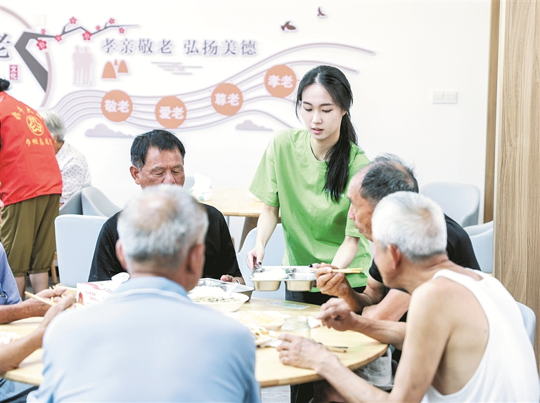图为7月15日,在浙江省诸暨市安华镇丰江周村爱心食堂,浙江农林大学暨阳学院的学生开展助餐志愿服务。 新华社记者 徐昱 摄