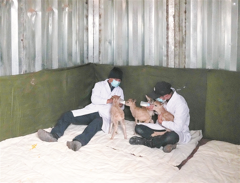 图为近日,巡山队员在可可西里卓乃湖保护站给救助的小藏羚羊喂奶。新华社记者 杜笑微 摄