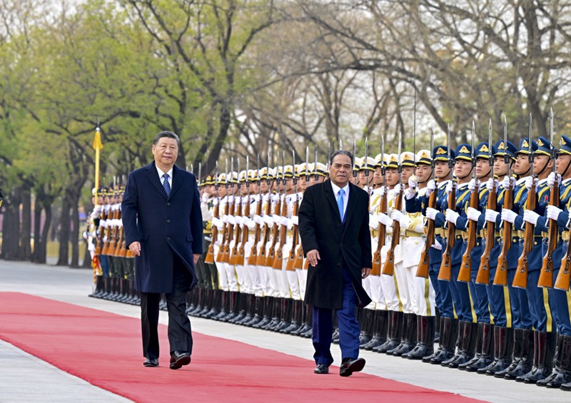 4月9日下午,国家主席习近平在北京人民大会堂同来华进行国事访问的密克罗尼西亚联邦总统西米纳举行会谈。这是会谈前,习近平在人民大会堂东门外广场为西米纳举行欢迎仪式。新华社记者 岳月伟 摄