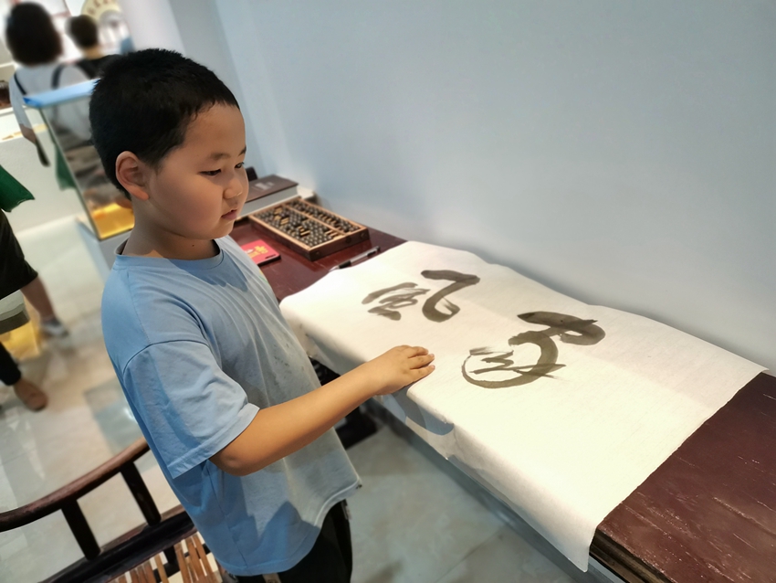 在洛阳市宜阳县锦屏镇后庄村的家风家训馆中,全家老少到此参观学习,爷爷给孙子讲述优良家风传统后现场挥毫书写“家风”,孩子看着字回忆着家风故事里的道理。(宜阳县纪委监委供 谷矿强摄)
