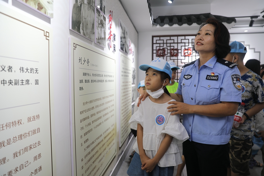 洛阳市汝阳县开展“携家人走进家风馆”活动,县公安局响应活动号召组织100余人到该县城关镇云梦家风家训馆参观,集中接受中华民族优秀家风家训和廉政文化教育。图中是民警任龑娜和她的女儿一同学习周恩来总理家风家训。(汝阳县纪委监委供 申继光摄)