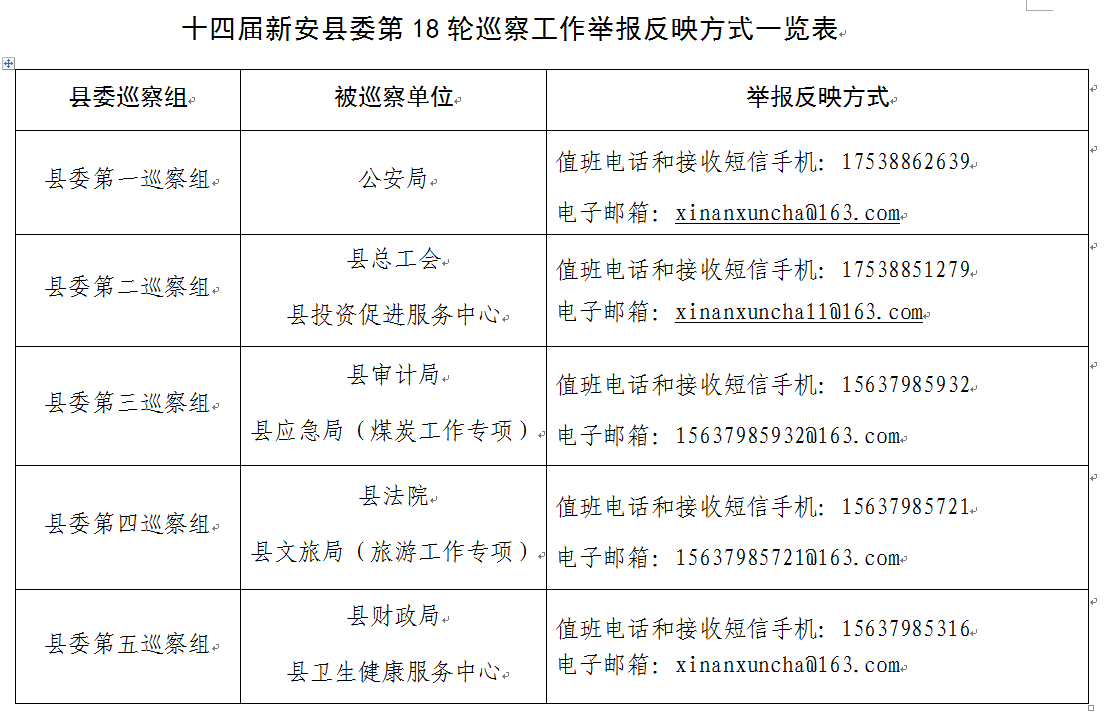 巡察期间,县委巡察组均开通专门值班电话、接收短信手机、电子邮箱,受理信访举报的时间为工作日的8:30至12:00,15:00至18:30,截止时间为2020年9月29日。