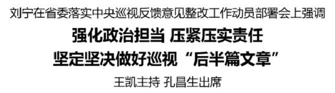 刘宁强调,党的十八大以来,以习近平同志为核心的党中央高度重视巡视和巡视整改工作,推动巡视成为党之利器、国之利器,发挥了标本兼治战略作用。抓好整改落实是深刻领悟“两个确立”的决定性意义、坚决做到“两个维护”的具体检验,是推动高质量发展、高效能治理的重要契机,是勇于自我革命、推进全面从严治党的有力抓手。要把思想和行动统一到习近平总书记重要讲话精神上来,旗帜鲜明讲政治,全面落实“五个进一步到位”重大要求,不断深化拓展全面从严治党成果,确保中央巡视反馈意见不折不扣落到实处。