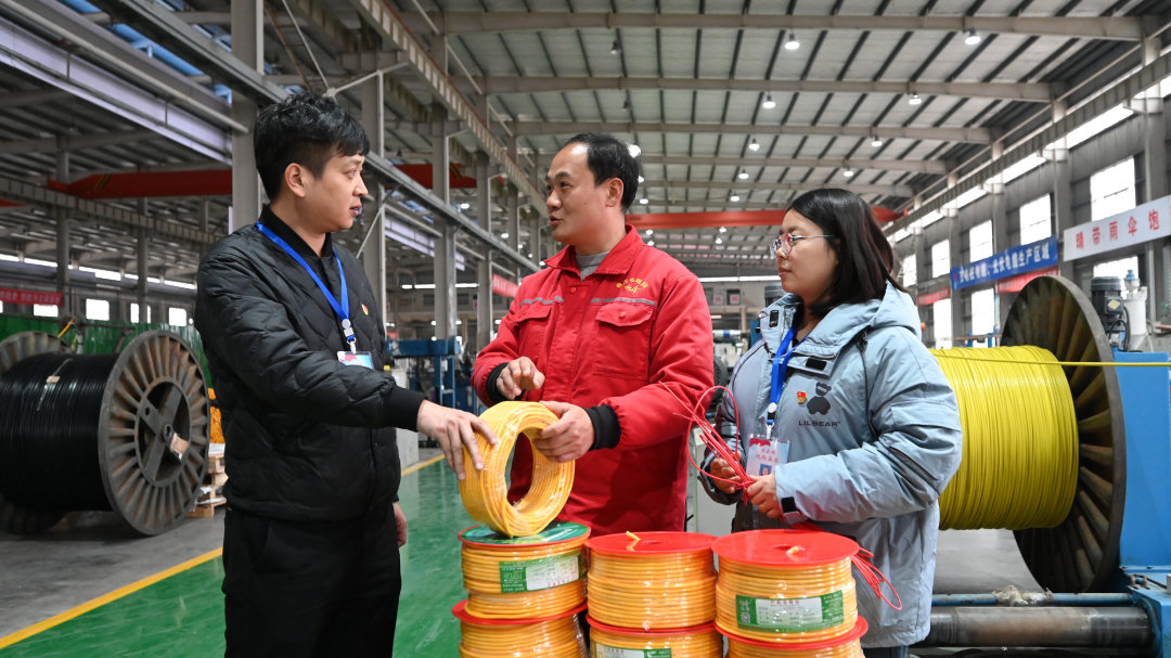 图为偃师区纪检监察干部到顾县镇春宾电缆集团有限公司生产一线走访了解相关情况,推动职能部门履职尽责、惠企政策落实落地,护航产业高质量发展。(牛光卫 摄)